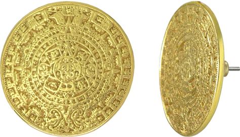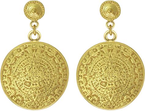 Across The Puddle, 24K Gold Plated Aztec Solar Calendar Earrings, Pre-Columbian Historical Jewelry Collection