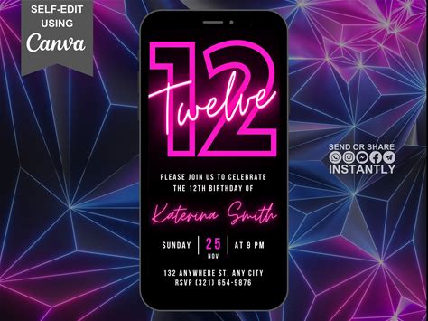 Digital 12th Birthday Invitation Template for Girls Neon Twelfth Bi