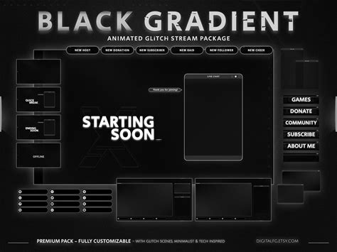 Black Gradient Complete Twitch Overlay, Animated Screens, Panels, Alerts, Overlay Set, Glitch Stream Package, Black And White, Aesthetic