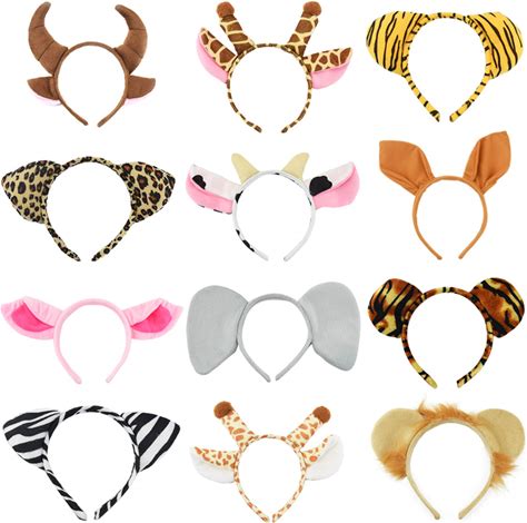 12 Pcs Zoo Animals Ears Headband Jungle Safari Animals Hairbands Plush Cartoon Headbands Elephant Lion Giraffe Tiger Zebra Leopard Cow Pig Ears