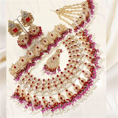Bridal Luxury 6 Piece Double Necklace Set Mehndi Red & Pink Traditional Heavy Pakistani Indian Nikkah Jewellery Wedding - Colours Available