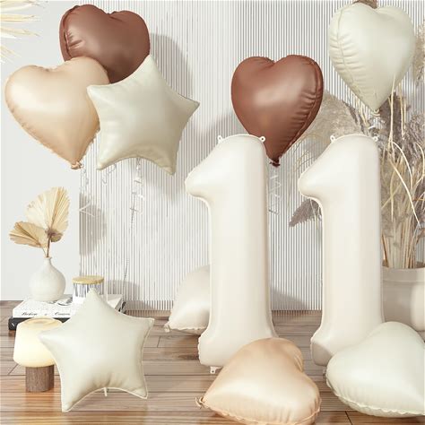 Large Number 11 Balloons, 40'' Beige Nude 11 Balloon With Foil Cream Star Balloon Decor, Neutral Brown Tan White Sand Helium Heart Balloon For Girls
